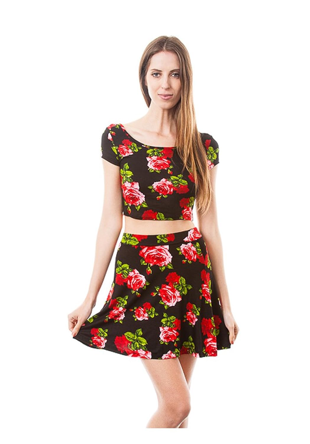 Rose Floral Print Cropped Top and Skater Skirt Set